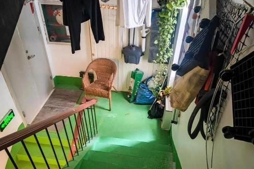 这是在广西某市一处写字楼的楼梯间拍摄的保洁员休息区(4月22日摄)。由于该楼没有固定的保洁人员休息室,保洁人员只能在楼梯间里休息,把工具和个人衣物暂时放在此处。