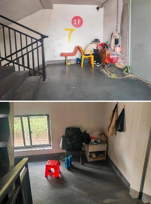 在广西某市一个商场,由于没有固定的休息室,保洁员只能在楼梯间里吃饭、休息(4月15日摄,拼版照片)。