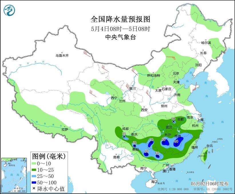 5月4日08时至5日08时,青海北部和南部、西藏南部、川西高原等地部分地区有小到中雪或雨夹雪;江淮南部、江汉南部、江南大部、西南地区东南部、华南北部等地部分地区有中到大雨,其中,湖南西部和东部、江西中部、贵州中部和东部、广西北部等地部分地区有暴雨(50~90毫米)。新疆东部、内蒙古中西部、青海北部、西北地区东部、甘肃河西、陕西北部、山东半岛等地部分地区有4~6级风,其中,内蒙古西北部、新疆东部等地部分地区有6~7级风。
