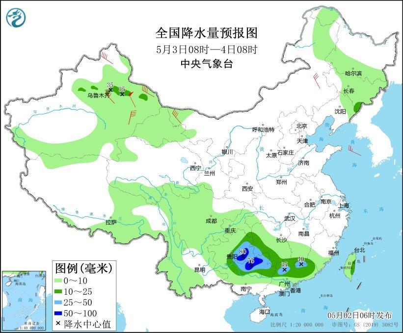 5月3日08时至4日08时,西藏中东部、青海南部、川西高原,新疆沿天山高海拔地区有小到中雪或雨夹雪,其中,新疆沿天山高海拔地区有大雪;新疆沿天山地区、吉林东南部、贵州东部和南部、湖南西部和南部、江西南部、广西北部、广东北部等地部分地区有中到大雨,其中,贵州东部、广西北部等地部分地区有暴雨(50~80毫米)。新疆北部和南疆盆地中东部、内蒙古西部和东部、甘肃河西等地部分地区有5~7级风,其中,新疆东部部分地区有7~8级风。