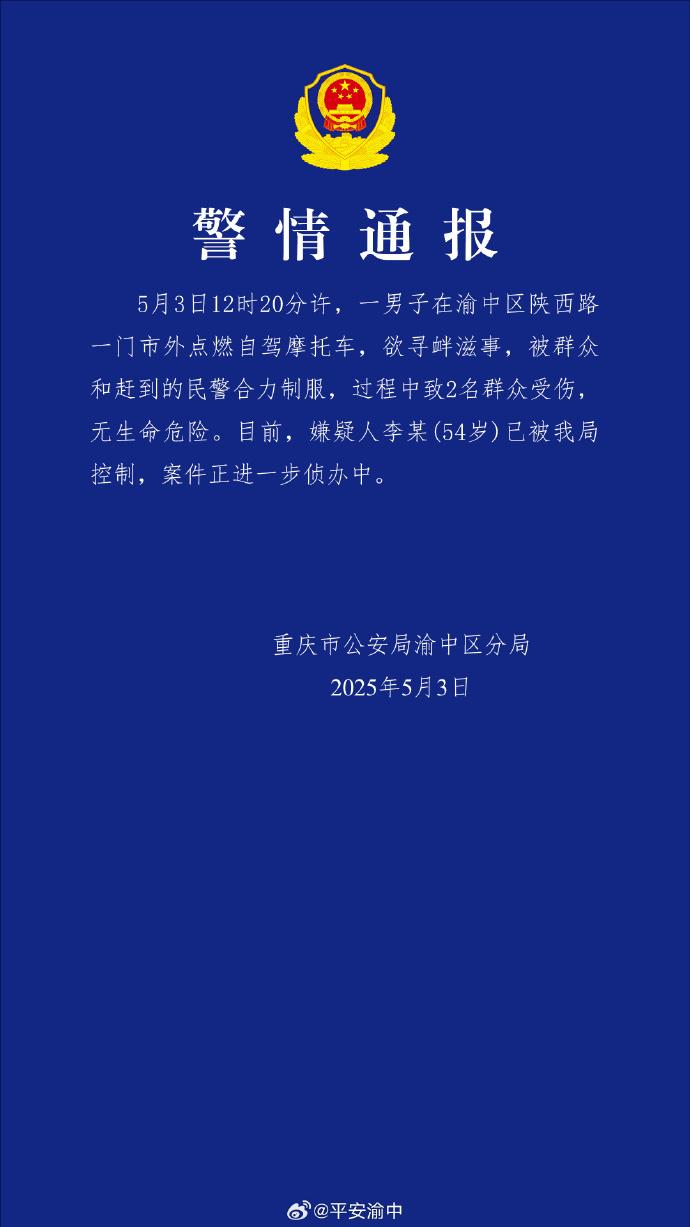 5月3日12时20分许,一男子在渝中区陕西路一门市外点燃自驾摩托车,欲寻衅滋事,被群众和赶到的民警合力制服,过程中致2名群众受伤,无生命危险。