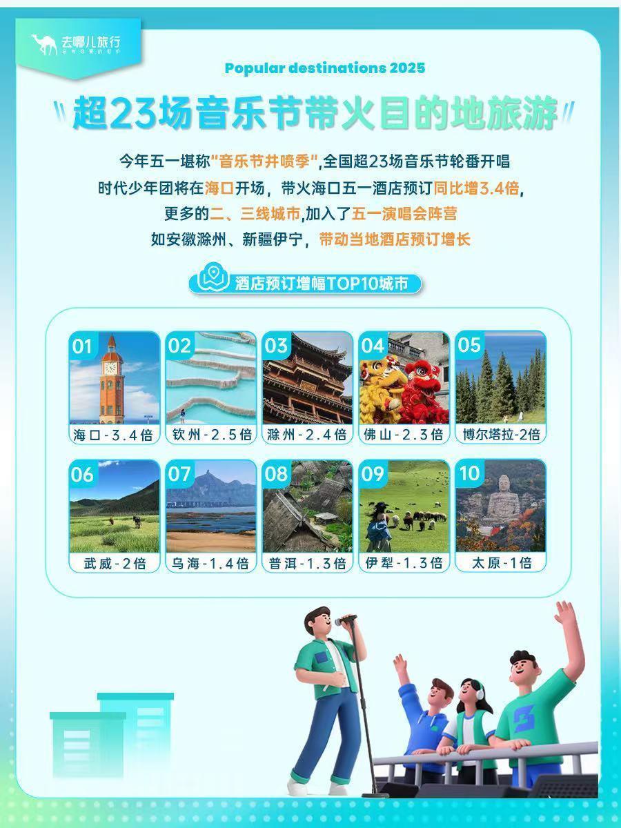 反向游、“文化+旅游”,景区门票预订同比增长超四成。全国超23场音乐节,带动热门城市酒店预订增幅超3倍。