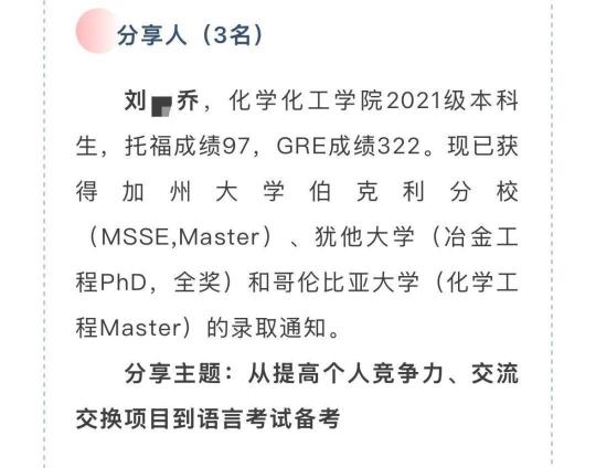 此外,红星新闻记者搜索发现,根据重庆大学此前发布的一则讲座信息介绍,刘某乔此前取得托福97分、GRE322分的成绩,现已获得加州大学伯克利分校、哥伦比亚大学等学校的录取通知。