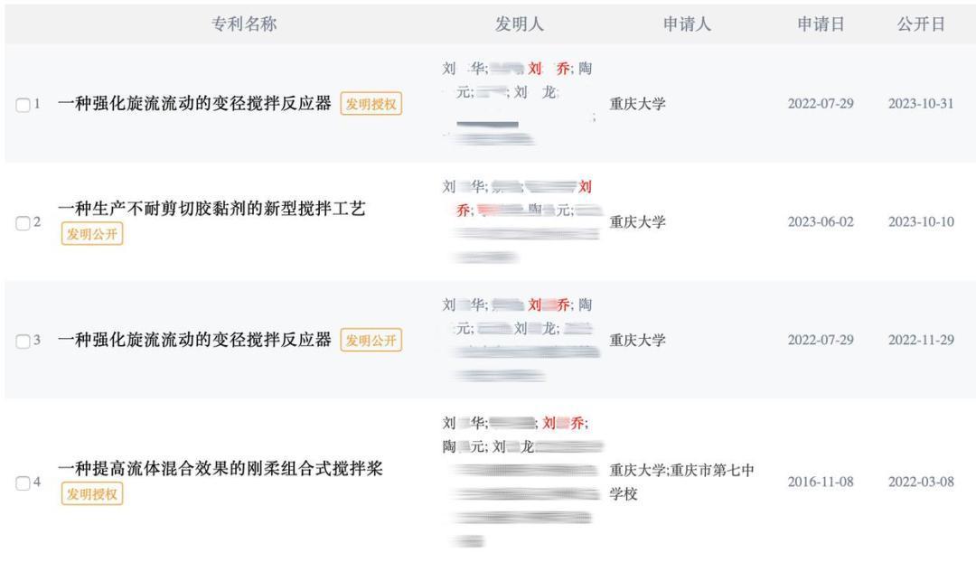 红星新闻梳理看到,这14项发明专利中,有10项标记为“发明公开”,另有4项标记为“发明授权”。但这14项发明专利的第一发明人均非刘某乔,除刘某乔之外,刘某华、刘某龙、陶某元三人均出现在14项专利发明人的名单中。记者在重庆大学官网看到,以上三人均系化工学院教授。