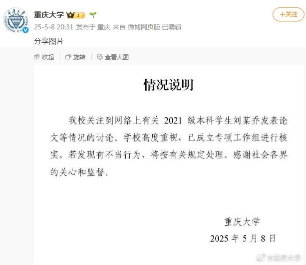 5月8日,重庆大学就网传“大四本科生已发14篇SCI论文”发布情况说明称,重庆大学关注到网络上有关2021级本科学生刘某乔发表论文等情况的讨论。学校高度重视,已成立专项工作组进行核实。若发现有不当行为,将按有关规定处理。