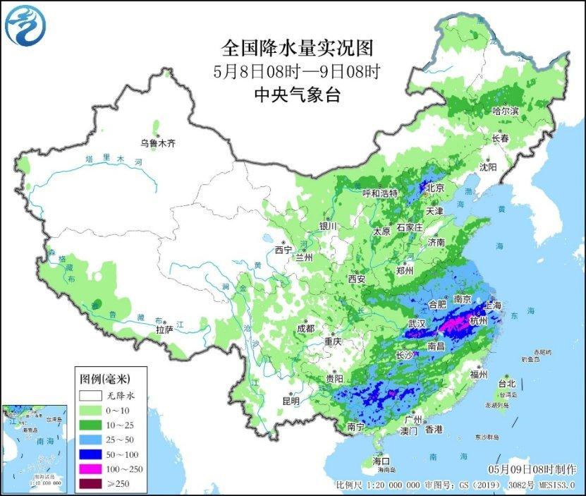 中新网5月9日电 据中央气象台网站消息,昨日,我国中东部地区降水范围广,气象监测显示,长江中下游至广西、广东北部一带普遍出现大到暴雨,安徽黄山、湖北咸宁、浙江杭州和衢州、江西景德镇和上饶、湖南永州、广西贺州和桂林、广东清远等局地大暴雨(100~218毫米);山西东北部、河北北部和东南部、北京西部和北部、黑龙江西南部等地部分地区出现大雨或暴雨,北京怀柔、河北承德等局地大暴雨;降雨期间还伴有强对流天气,上述地区最大小时降雨量40~80毫米,广西柳州局地96毫米,湖南东部、江西西部、广西北部等地局地出现雷暴大风。