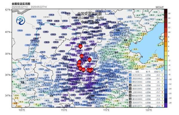 降温幅度超20℃!今天(5月22日)在冷空气和降雨的影响下,大范围高温被“扑灭”,内蒙古中部、陕西、山西、河南北部、湖北西北部等地降温明显,多地降温超过了14℃。山西降温最为猛烈,大部地区降幅超20℃,昨天还像炎热夏天,今天午后就又回到春天。