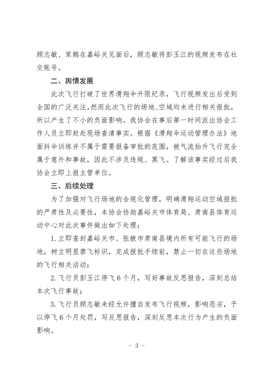 央视网消息:据甘肃省航空运动协会微信公众号消息,近日,男子玩滑翔伞被“云吸”至8589米高空引关注。5月28日,甘肃省航空运动协会发布关于彭玉江在祁连山区域飞行事件的报告,对涉事飞行员彭玉江停飞6个月。