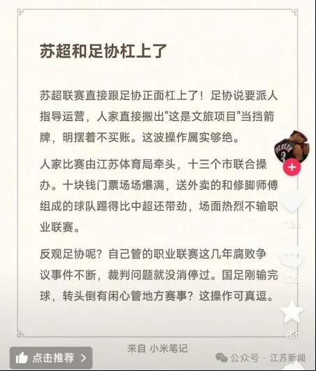 近期,网上有人发帖称:“苏超”直接跟中国足协正面杠上了!足协说要派人指导运营,江苏足协直接搬出“这是文旅项目”当挡箭牌,明摆着不买账。