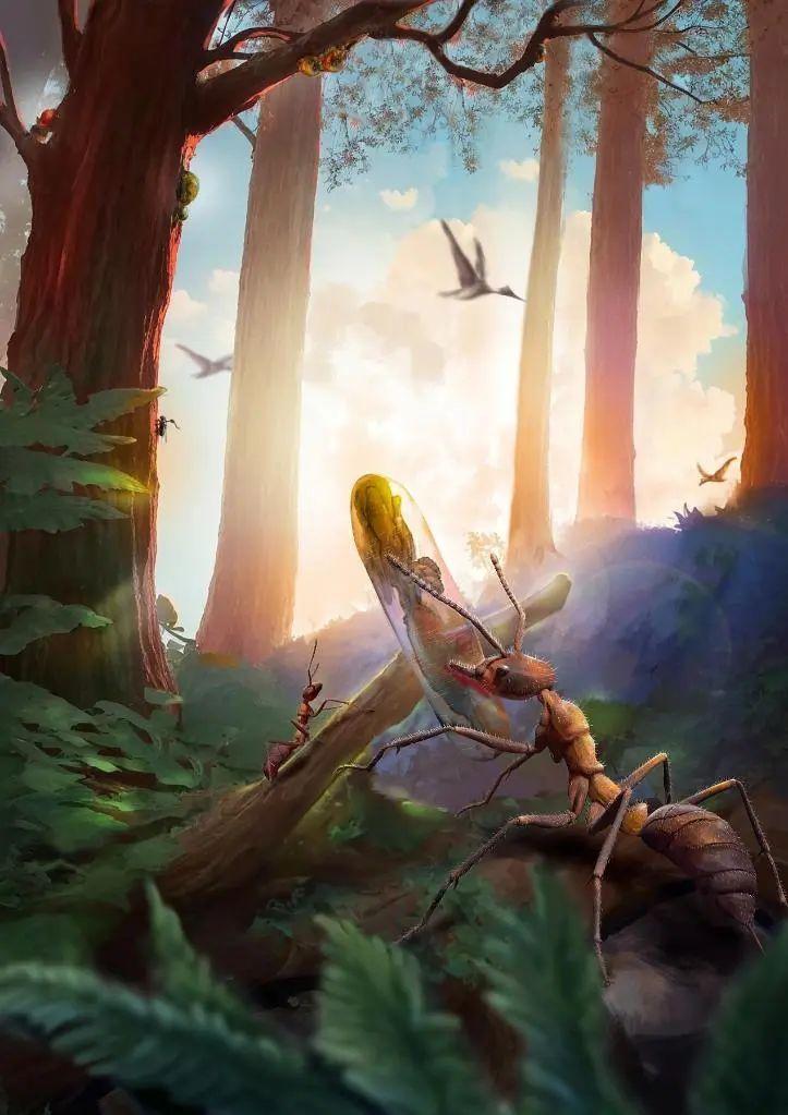 白垩纪时期蚂蚁、蝇类与古线虫草的古生态重建图。(中国科学院南京地质古生物研究所供图杨定华绘制)
