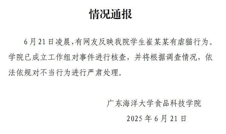 6月21日,广东海洋大学食品科技学院网站发布情况通报,全文如下: