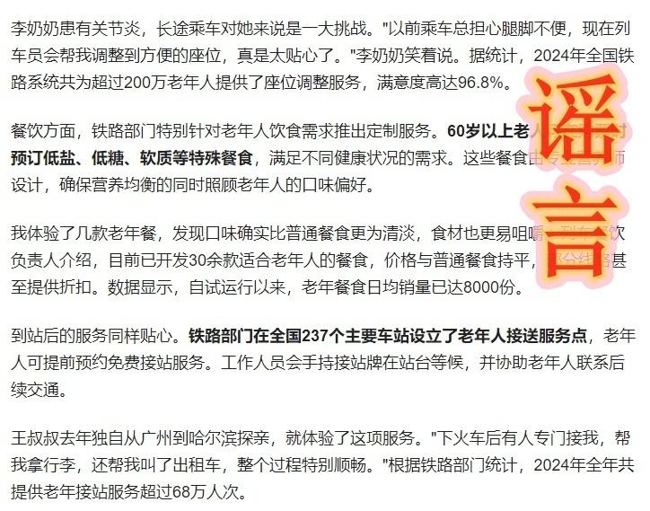 近日,有部分自媒体宣称“铁路部门规定,60岁以上乘坐火车和高铁,可享受5大福利”,其中包括“60-69岁老年人可享受火车票七折优惠、70岁以上老年人可全年享受六折优惠”等内容。