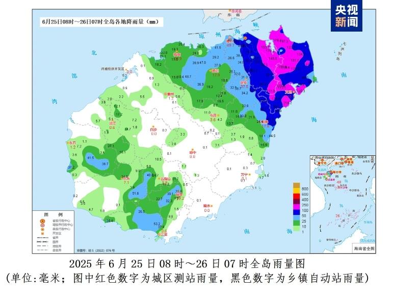 记者从海南省气象部门获悉,受热带低压影响,25日08时—26日07时,海南岛东北部地区普降暴雨、个别乡镇雨量达大暴雨,文昌和海口两个市县共20个乡镇(区)雨量超过100毫米,最大为文昌市会文镇218.2毫米,其余地区出现阵雨或雷阵雨。另外,海南岛东部沿海陆地及近海出现7—9级阵风,最大为东部近海9级(22.2米/秒)。此外,三沙市最大雨量为南沙群岛渚碧礁48.4毫米,最大阵风为南沙群岛永暑礁7级(15.9米/秒)。