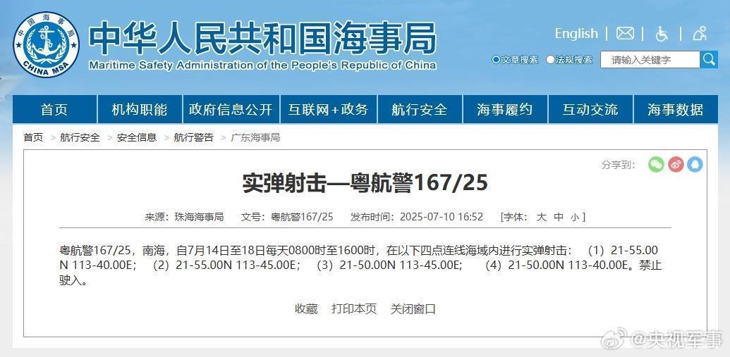 据中国海事局网站消息,珠海海事局发布航行警告,7月14日至18日每天8时至16时,南海部分海域进行实弹射击,禁止驶入。