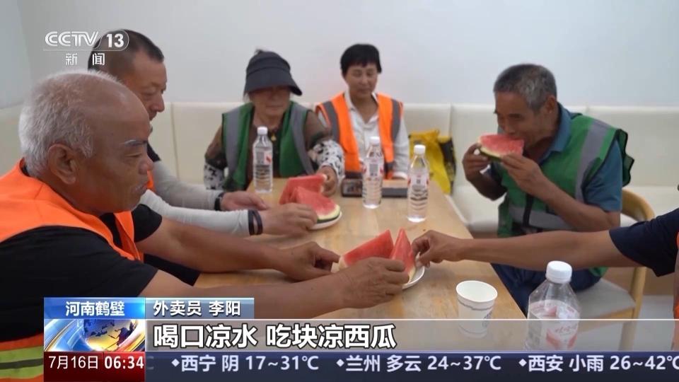 外卖员 李阳:现在都是40℃左右的高温天气,十几分钟吧,在街上就能找到一家驿站进来歇歇脚,喝口凉水,吃块凉西瓜,感觉要清凉多了。