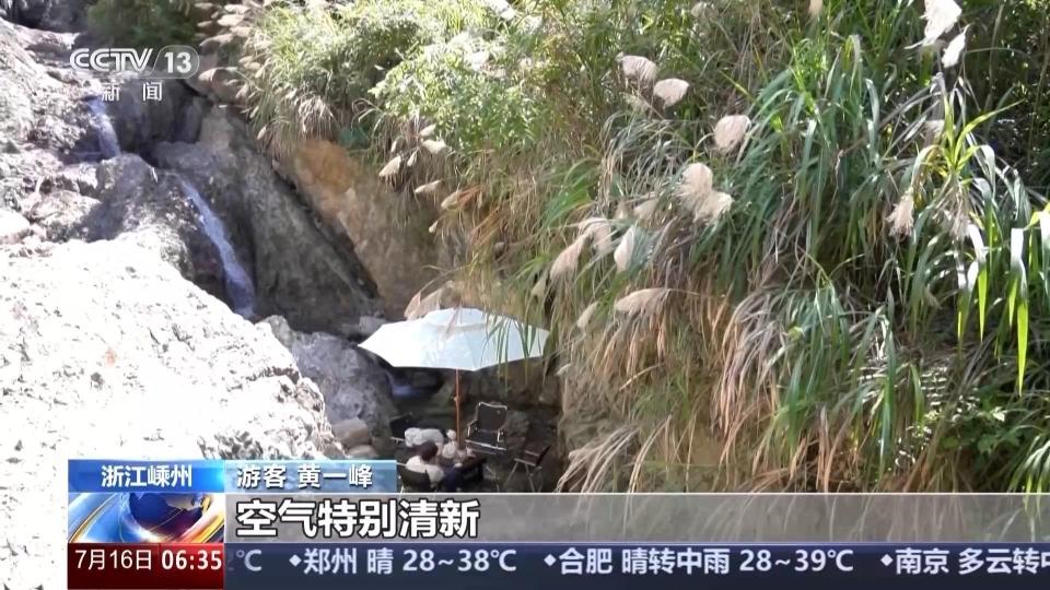 在高温天气下,浙江嵊州开发出了天然山水清凉游模式。在位于海拔近400米的金庭镇东坑村八月岭,游客们驱车来到这里,享受夏日高温下的一份清凉,体验刚建成的水上森林公园。在这里,孩子们可以尽情地玩水嬉戏;也可以在溪流中撑开遮阳伞,既凉爽又惬意。