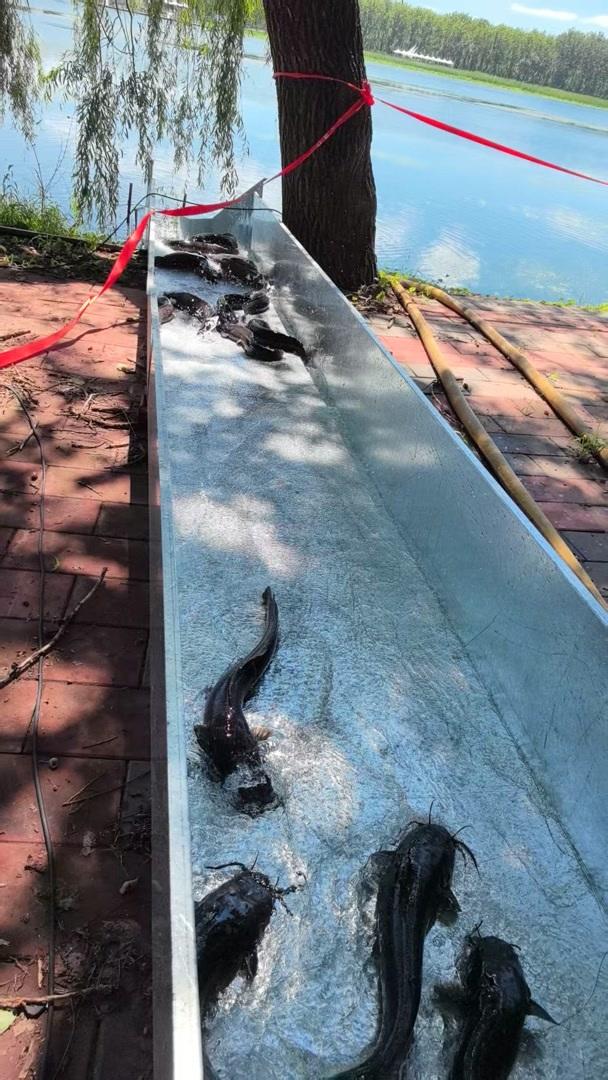 记者观察发现,不少大鱼入水后并不游走,而是顺着不锈钢滑道使劲往回游。对此,一位观看放生的老人说,这是因为河水温度比鱼车的水温高,“鱼不适应河水的温度,所以不愿下去。”