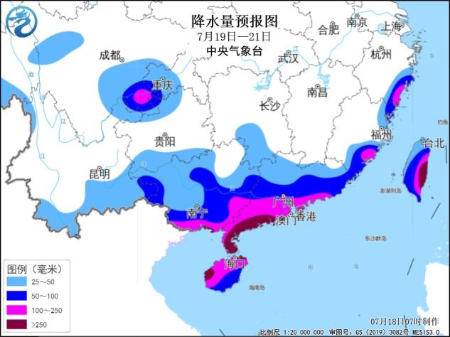 降雨预报:19日至21日,华南、浙闽沿海、台湾岛等地有大到暴雨,其中广东西部和南部、广西南部、海南岛、台湾岛东部等地部分地区有大暴雨,广东西南部沿海、广西南部沿海、海南岛西部、台湾岛东部等局地特大暴雨;上述部分地区累计降雨量有150至300毫米,局地可达400毫米以上。过程主要影响时段为19日夜间至20日夜间。