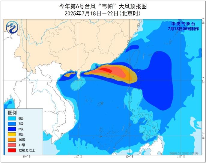 大风预报:18日至22日,南海北部、广东沿海、广西沿海、北部湾的风力有8至10级、阵风11至12级,台风中心经过的附近海域或地区的风力有11至14级、阵风15至16级。