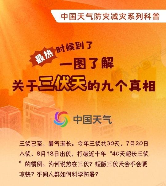 今天(7月20日),我国正式入伏,意味着一年中最热的时候来了。今年为30天短版三伏,打破了近十年“40天超长三伏”的惯例。为何说热在三伏?短板三伏天会不会更凉快?不同人群如何科学防暑?一图了解关于三伏天的9个真相。