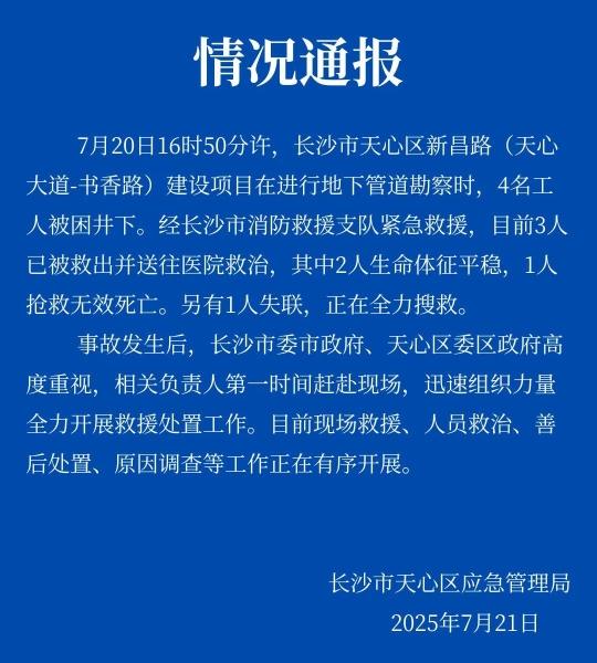 7月20日16时50分许,长沙市天心区新昌路(天心大道-书香路)建设项目在进行地下管道勘察时,4名工人被困井下。经长沙市消防救援支队紧急救援,目前3人已被救出并送往医院救治,其中2人生命体征平稳,1人抢救无效死亡。另有1人失联,正在全力搜救。