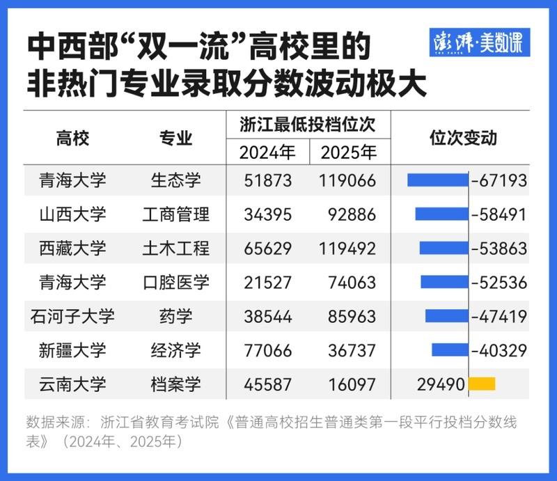 以浙江今年的投档线为例,“双一流”高校里波动幅度动辄5万名上下的,大多集中在青海大学、西藏大学等中西部高校,而专业也主要是生态学、工商管理这些冷门或就业前景较差的专业。