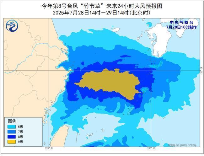 大风预报:7月28日14时至29日14时,东海大部、台湾以东洋面、杭州湾、长江口区、上海沿海、江苏南部沿海、浙江沿海将有7-8级、阵风9-10级的大风;台风中心经过的部分海域风力可达9级、阵风10-11级。
