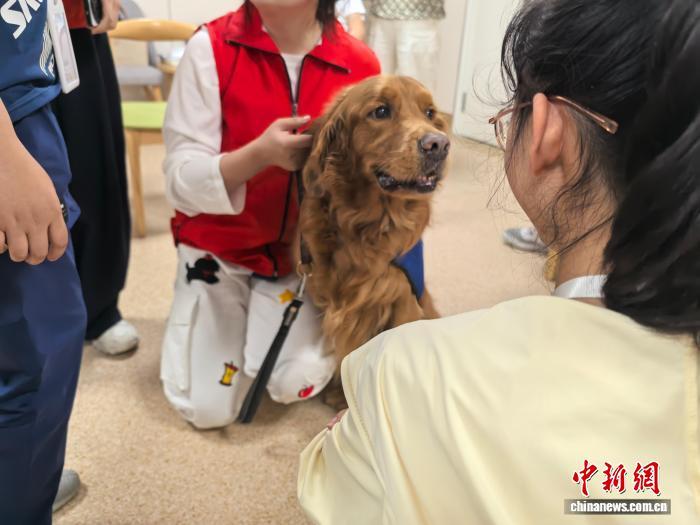 在同济大学附属精神卫生中心中西医结合失眠诊疗中心,一群孩子与四条治疗犬相遇,撸一撸乖巧的治疗犬,在与狗开心地游戏、互动中,孩子们的脸上绽放出开心的笑容。