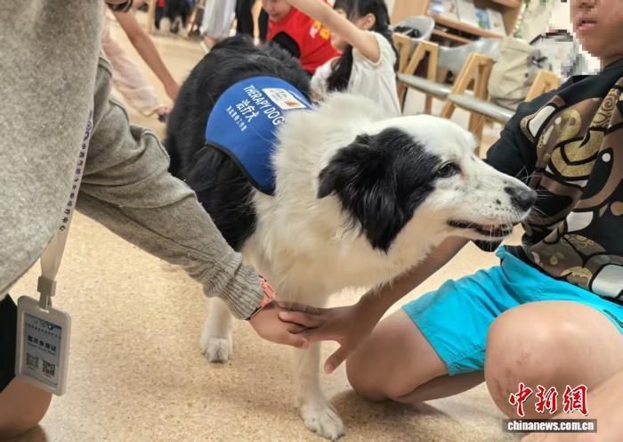 另一条治疗犬可乐也是一条黑白边牧。它静静地蹲坐着,眼神清澈。可乐的“妈妈”(主人)告诉记者,可乐性格十分温顺,情绪很稳定,从不会乱跑、乱叫。与可乐一起玩耍的小王说,摸摸狗狗的毛,和狗狗互动,真的很开心。