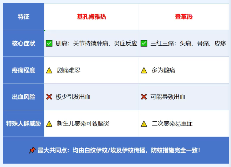 1、突发39℃以上高烧 +关节痛、皮疹、头痛、眼眶痛、全身肌肉痛