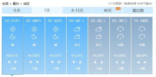 此外,随着大陆高压脊逐步东移,副热带高压会加强西伸与大陆高压连通,8月3日到6日我国的高温将进入高温鼎盛时段,届时四川盆地、陕西关中、河北南部、河南、湖北等地都会出现最高气温超过40℃的情况,其中四川盆地和陕西关中的暑热尤其强,部分地区最高气温将连续超过40℃,例如重庆,3到6日期间最高气温可能都会达到41℃,酷热程度同期少见,或有一定极端性。