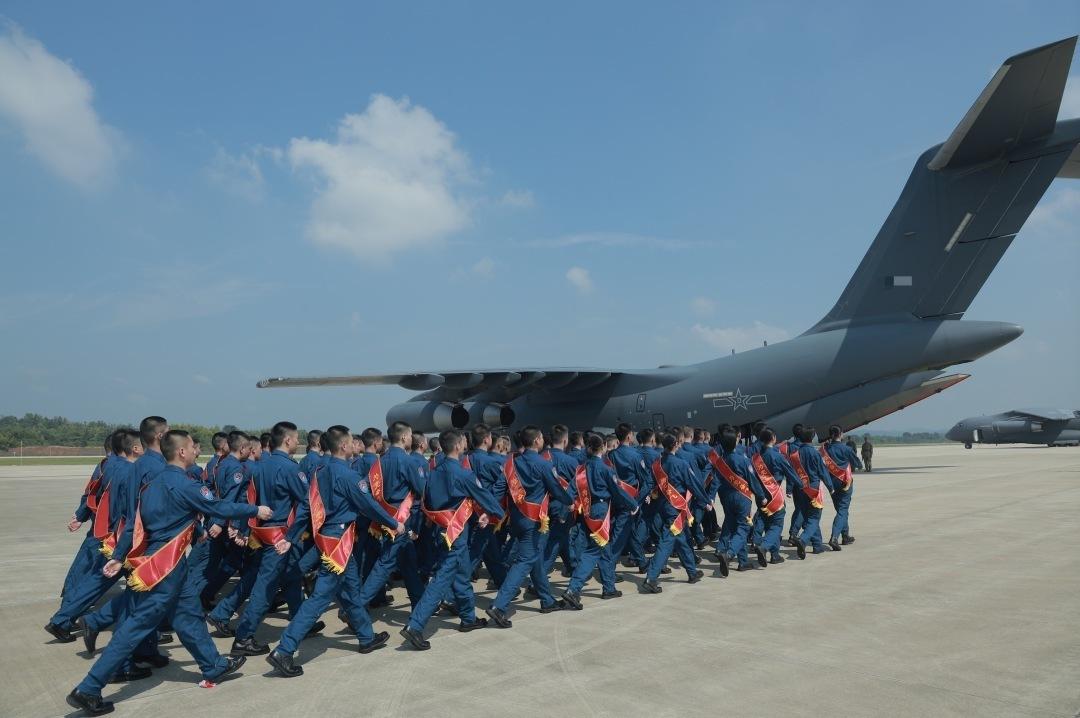 仪式现场,飞行员代表与新学员齐聚一堂,分享成长经历。起飞后,运-20机长代表机组发出寄语,勉励新学员奋楫扬帆、逐梦而行,以青年之姿担时代重任,怀赤诚之心守万家灯火,用青春脚步踏响强军征程。