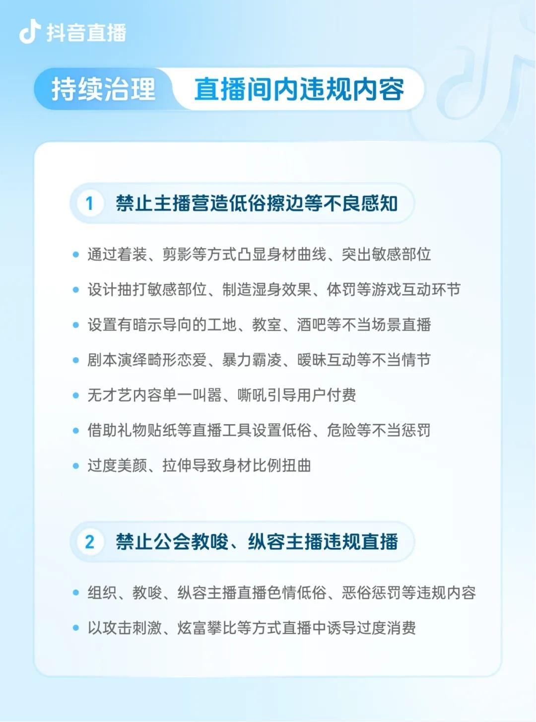 为进一步规范行业,引导行业各方高质量发展,近日,抖音升级《抖音直播团播内容管理规范》,并同步发布《抖音直播团播机构管理规范》。在持续打击色情低俗、恶俗PK、侵害未成年人权益等违规内容及行为的基础上,针对主播通过营造虚假亲密关系诱导打赏、公会设置不合理直播时长或不合理高额违约金侵害主播合法权益等突出问题,上述规范新增了更严格治理举措。