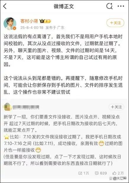客村小蒋表示,首先,微信不是用用户手机本地时间校验的。其次,从没点过接收的文件,过期就是过期了。另外,聊天里的图片、视频、文件的过期时间是14天,不是7天,这可能是这个博主所谓的自己试过有用的原因。