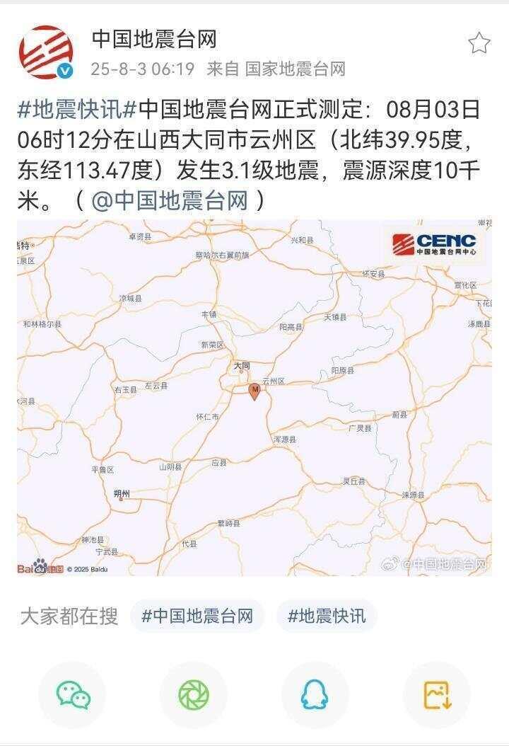 8月4日,记者致电山西省地震局咨询相关情况,一名工作人员表示,此次大同地震属于天然地震,有轻微震感,暂无人员伤亡报告,大同地区历史上曾发生过地震。