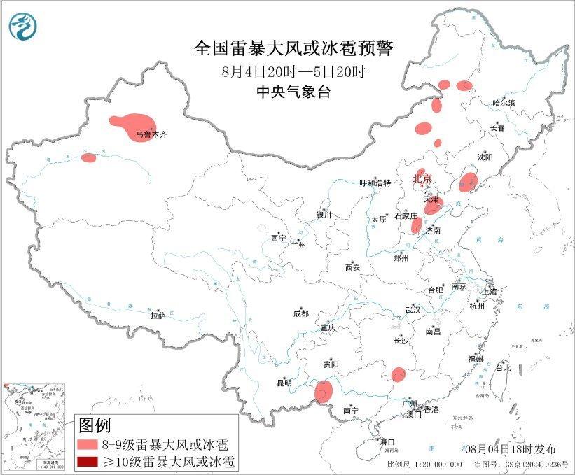 预计8月4日20时至5日20时,新疆西部、内蒙古中东部、华北北部和南部、华南西部和北部等地的部分地区将有8级以上雷暴大风或冰雹天气;新疆西部、内蒙古中东部、西北地区东部和南部、华北、西南地区中东部、华南等地的部分地区将有小时雨量大于20毫米的短时强降水天气,其中,河北中南部、北京中东部、福建东部、广西东部、广东中部和西南部等地的部分地区小时雨量大于50毫米,最大可达80毫米以上。