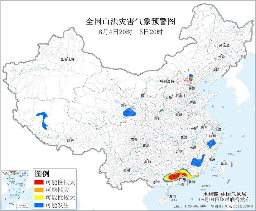 预计,8月4日20时至5日20时,北京东北部、河北北部、广东中部和西部、广西东部等地部分地区发生山洪灾害可能性大(橙色预警),其中,广东中部和西部、广西东部局地发生山洪灾害可能性很大(红色预警)。其他地区也可能因局地短历时强降水引发山洪灾害,请各地注意做好实时监测、防汛预警和转移避险等防范工作。