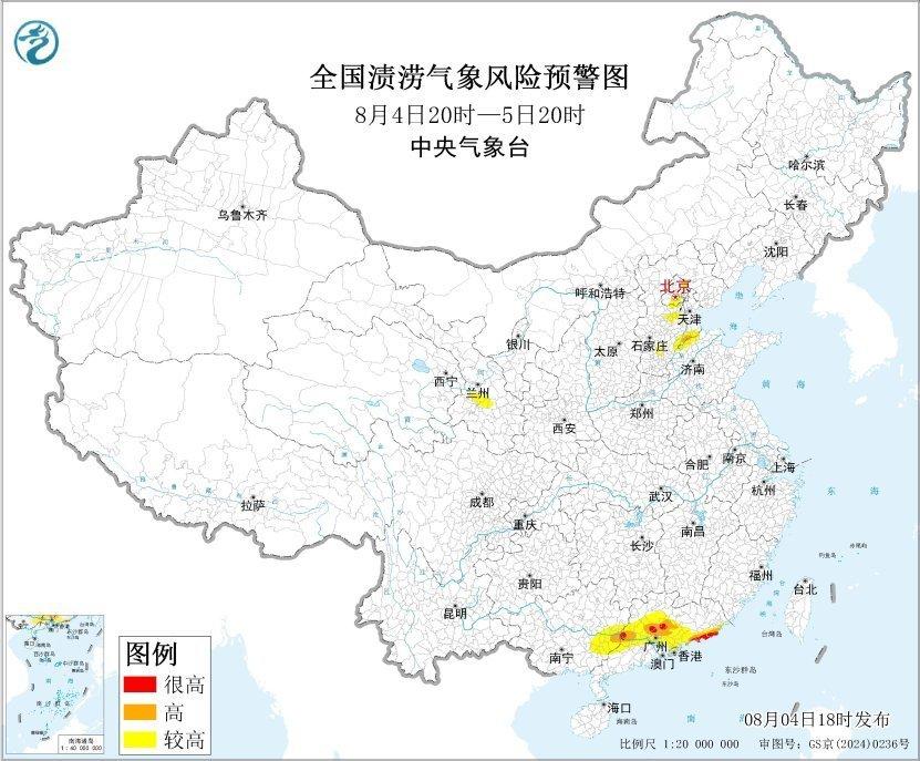 受强降雨的影响,预计8月4日20时至5日20时,北京南部和东北部、河北中南部和东北部、山东西部、广东东南部和中西部、广西东部、甘肃南部等地发生渍涝的气象风险较高,其中,河北东南部、山东西部、广东东南部和中西部、广西东南部等地部分地区发生渍涝的气象风险高,广东东南部和中西部局地发生渍涝的气象风险很高,极易形成城市内涝和农田渍害,需加强防范。