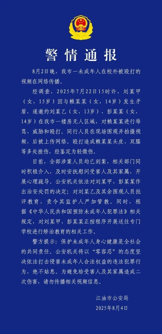 经调查,2025年7月22日15时许,刘某甲(女,15岁)因与赖某某(女,14岁)发生矛盾,遂邀约刘某乙(女,13岁)、彭某某(女,14岁)在江油市一楼房无人区域,对赖某某进行辱骂、威胁和殴打。同行人员在现场围观并拍摄视频,后被上传网络。殴打造成赖某某头皮、双膝等多处挫伤,经鉴定为轻微伤。