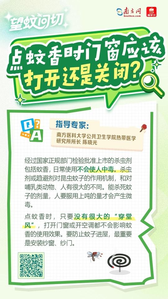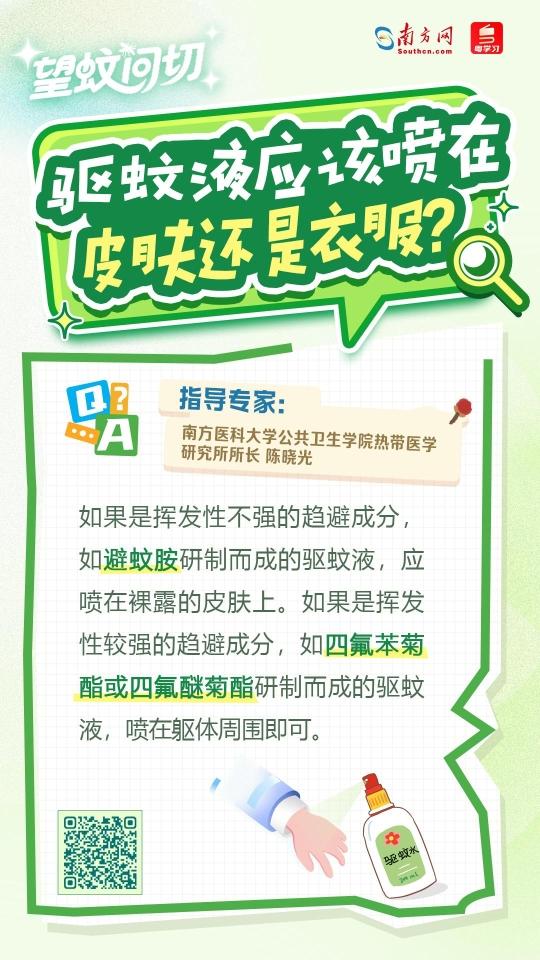 驱蚊液应该喷在皮肤还是衣服?开空调可以驱蚊吗?点蚊香应该开窗还是关窗?南方网、粤学习记者搜集网友关于驱蚊最关心的问题,专访南方医科大学公共卫生学院教授、热带医学研究所所长陈晓光。