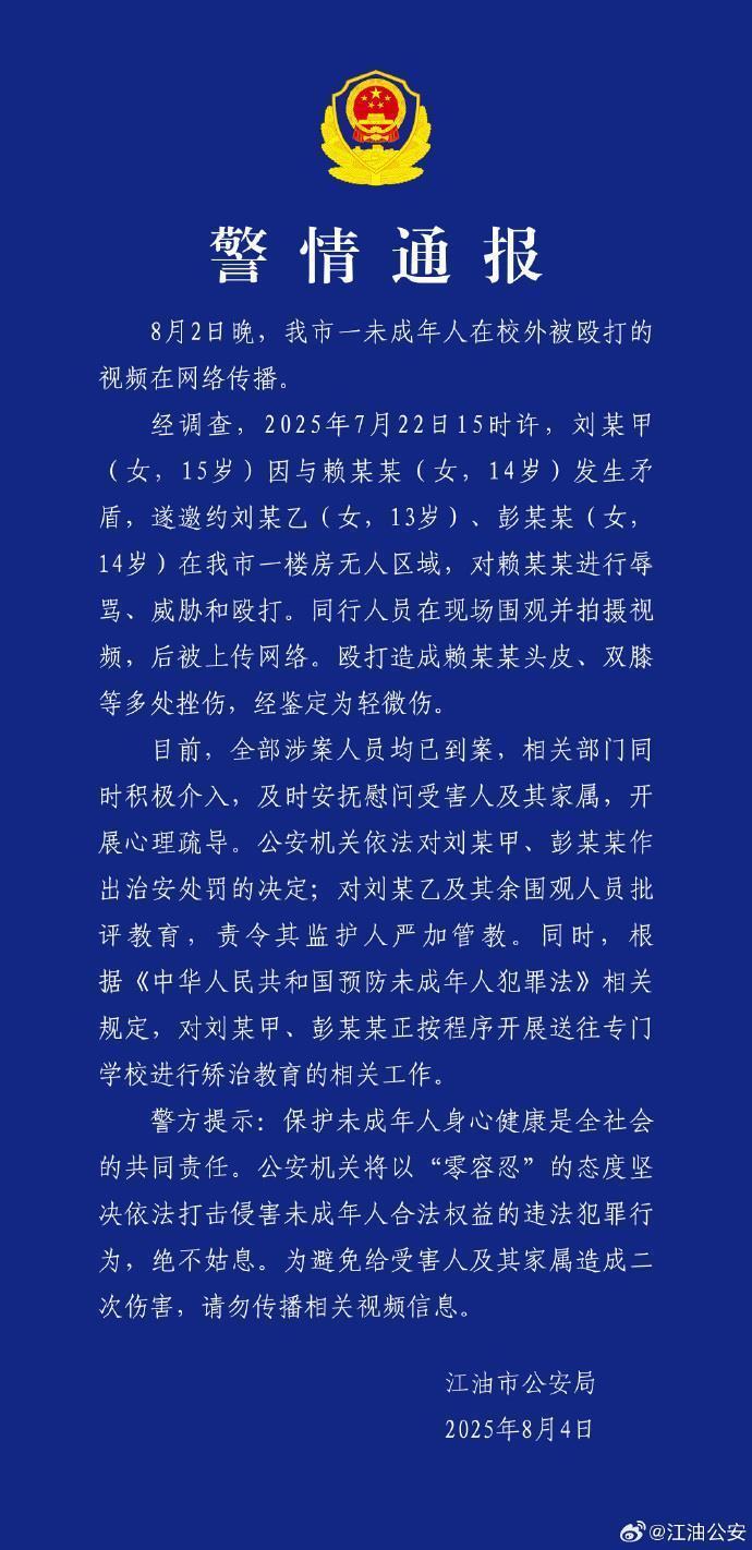 四川绵阳江油市公安局8月4日发布警情通报称,2025年7月22日15时许,刘某甲(女,15岁)因与赖某某(女,14岁)发生矛盾,遂邀约刘某乙(女,13岁)、彭某某(女,14岁)在江油市一楼房无人区域,对赖某某进行辱骂、威胁和殴打。同行人员在现场围观并拍摄视频,后被上传网络。殴打造成赖某某头皮、双膝等多处挫伤,经鉴定为轻微伤。