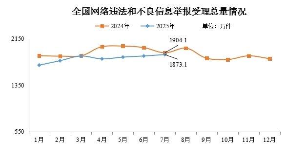 据中央网信办(国家网信办)违法和不良信息举报中心官方微博消息,2025年7月,中央网信办举报中心指导全国各级网信举报工作部门、主要网站平台受理网民举报色情、赌博、侵权、谣言等违法和不良信息1873.1万件,环比增长1.3%、同比下降1.6%。