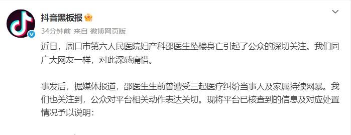 近日,周口市第六人民医院妇产科邵医生坠楼身亡引起了公众的深切关注。8日,抖音黑板报微博发文回应相关账号处置情况: