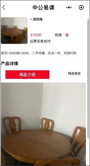 而在中公教育“中公易课AI助学”微信小程序上,除了售卖课程,还有二手家具、酒水等供消费者下单。一套二手桌椅售价5200元。