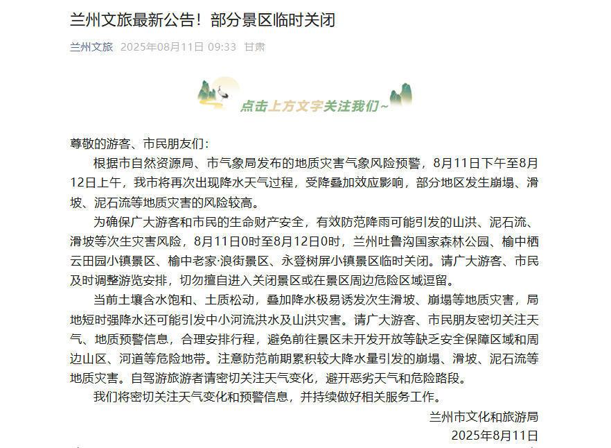 为确保广大游客和市民的生命财产安全,有效防范降雨可能引发的山洪、泥石流、滑坡等次生灾害风险,8月11日0时至8月12日0时,兰州吐鲁沟国家森林公园、榆中栖云田园小镇景区、榆中老家·浪街景区、永登树屏小镇景区临时关闭。请广大游客、市民及时调整游览安排,切勿擅自进入关闭景区或在景区周边危险区域逗留。