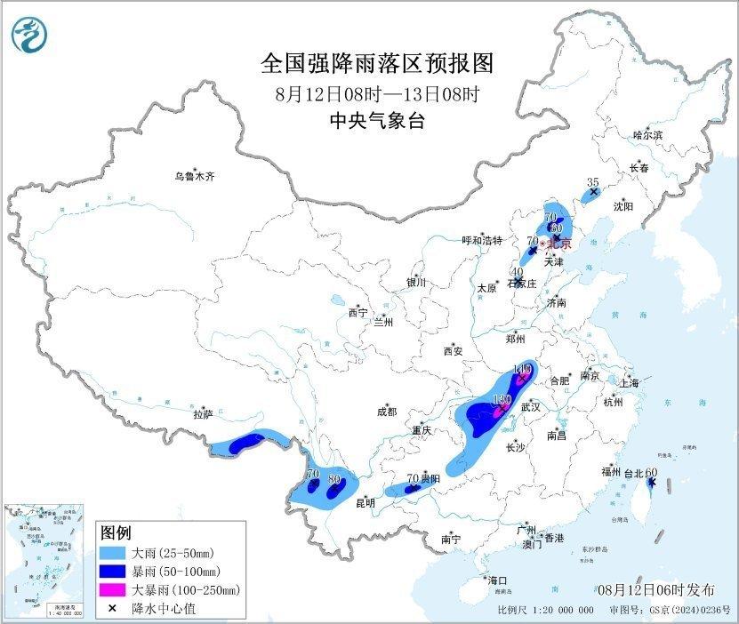 预计,8月12日8时至13日8时,河南南部、湖北中部和西南部、湖南西部和北部、贵州东部和南部、云南北部、河北西部和东北部、北京西部和北部、天津北部、台湾岛东北部、西藏东南部等地部分地区有大到暴雨,其中,河南南部、湖北东北部和西南部、湖南北部等地部分地区有大暴雨(100~140毫米)。上述部分地区伴有短时强降水(最大小时降雨量20~50毫米,局地可超过60毫米),局地有雷暴大风等强对流天气。