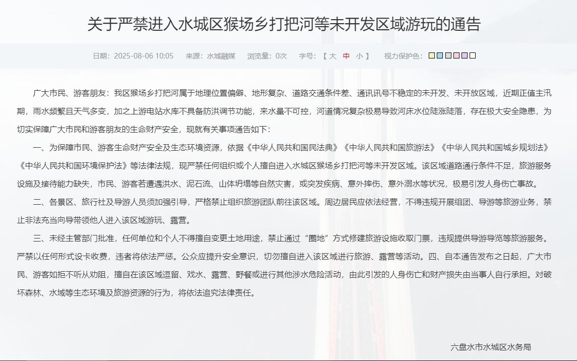 案例三:2025年6月30日,两名游客自驾前往贵州六盘水蟠龙镇一河边露营时,遭遇强降雨引发的山洪,7月15日,救援人员在下游猴场乡的河中发现男子已遇难,女子至今失联。