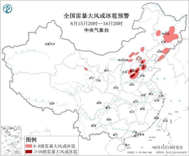 预计8月15日20时至16日20时,东北地区中部和南部、华北等地的部分地区将有8级以上雷暴大风或冰雹天气,其中,山西东部、河北南部、天津北部、河南北部等地的部分地区将有10级以上雷暴大风;东北地区大部、华北中南部、西北地区东南部、西南地区东部、华南南部等地的部分地区将有小时雨量大于20毫米的短时强降水天气,其中,黑龙江南部、辽宁东部和南部、山西东部、河北中南部和东北部、天津、四川中东部等地的部分地区小时雨量大于50毫米,最大可达80毫米以上。