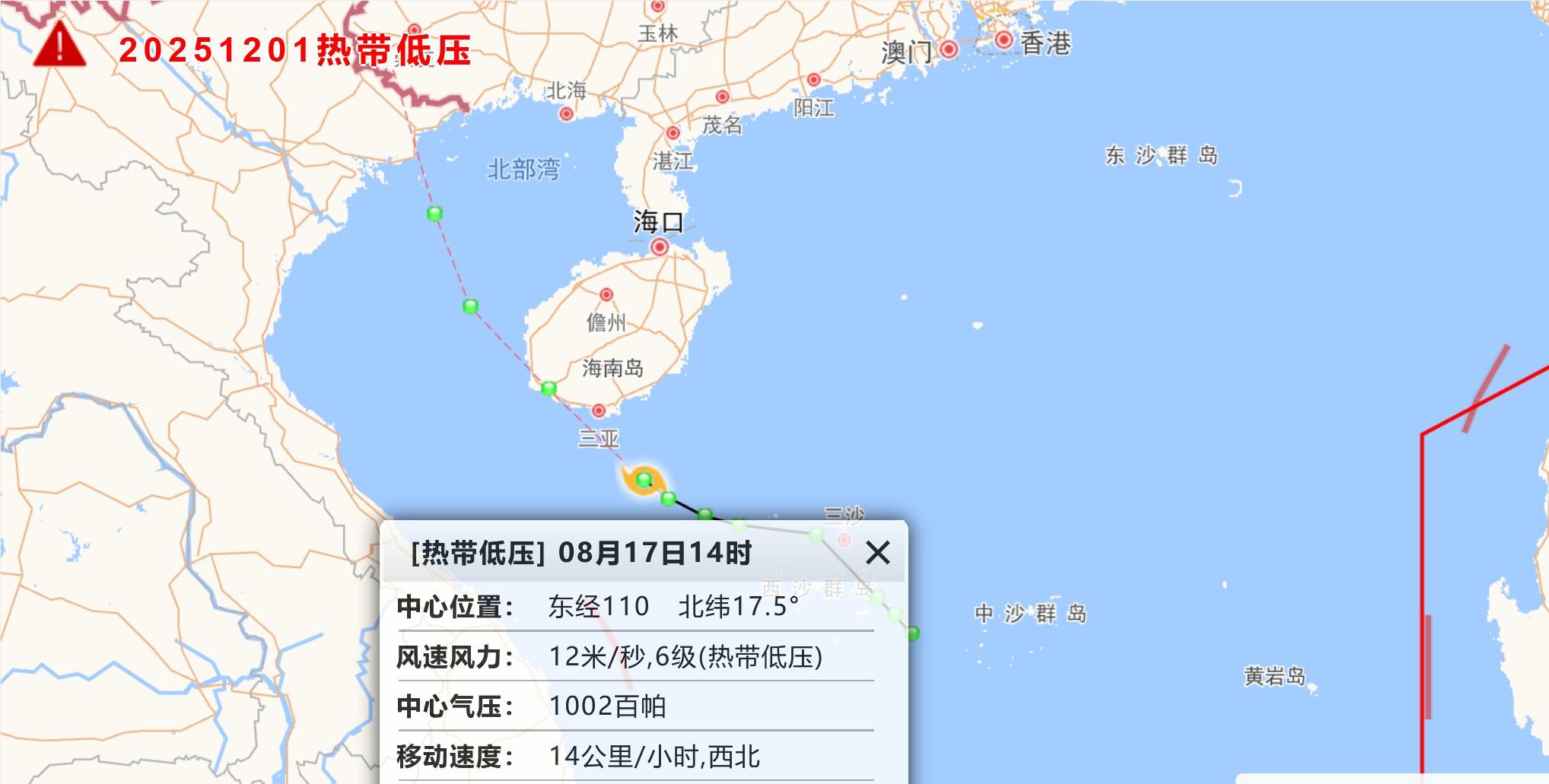 记者17日从海南省气象局了解到,南海热带低压17日14时中心位于北纬17.5度、东经110.0度,也就是在距离海南省三亚市南偏东方向约100公里的海面上,中心附近最大风力6级(12米/秒)。