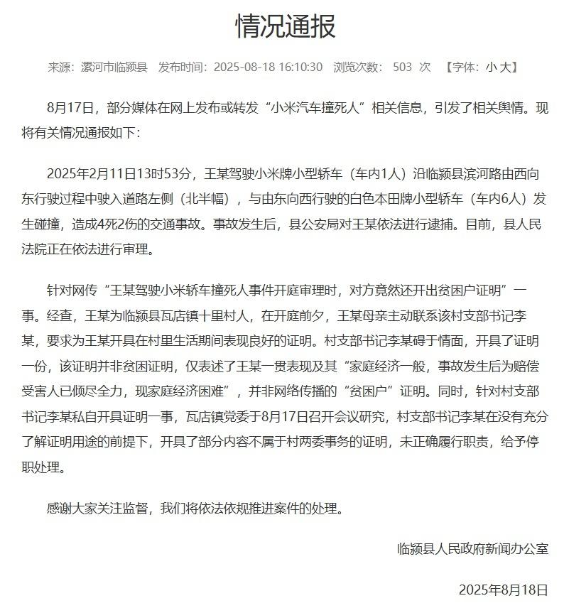 8月17日,部分媒体在网上发布或转发“小米汽车撞死人”相关信息,引发了相关舆情。8月18日,河南省漯河市临颍县人民政府将有关情况通报如下: